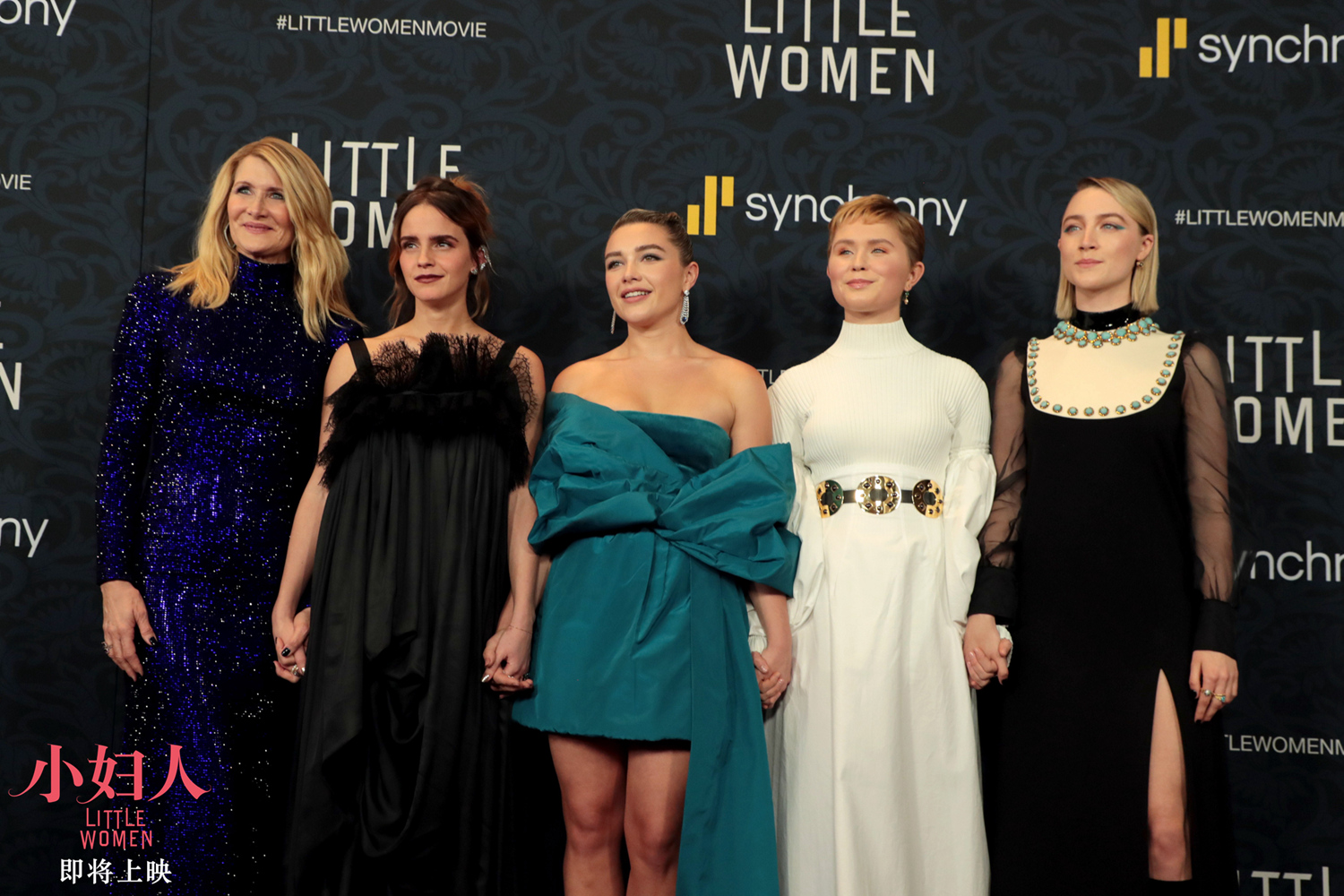 首映礼现场,西尔莎·罗南淡蓝色的眼眸下,别出心裁的在眼角搭配了一缕“蓝色凤尾”,与她身着的黑色礼服上的同色系配饰互相呼应,在清新脱俗中赋予了一份主人公乔·马奇追求真我,坚毅果敢的气质。而艾玛·沃森以蕾丝领小黑裙亮相,颠覆以往的造型,与影片中大姐梅格沉稳懂事的性格不谋而合。伊莱扎·斯坎伦纯白色礼服、干练的短发,20岁的年纪却气场十足,同样印证了她在影片中温柔又坚强的人物形象。佛罗伦斯·珀则是蓝色抹胸短裙登场,腰间的蝴蝶结造型与红毯中全程甜美的笑容,尽显马奇小女儿的俏皮可爱。同时,与“马奇四姐妹”一同亮相红毯的还有“马奇太太”金球奖影后劳拉·邓恩。她们在红毯中交流不断,合影时互相牵手,十指紧扣,戏里戏外亲密无间。