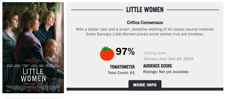 由美国哥伦比亚影片公司出品、改编自同名经典小说的新片《小妇人》在北美定档圣诞节上映,许多提前看过该片的外媒评价影片“新鲜”、“现代”、“自然”、“充满活力”,主创成功地令这个经典故事焕然一新,为小妇人们“穿上新装”。
