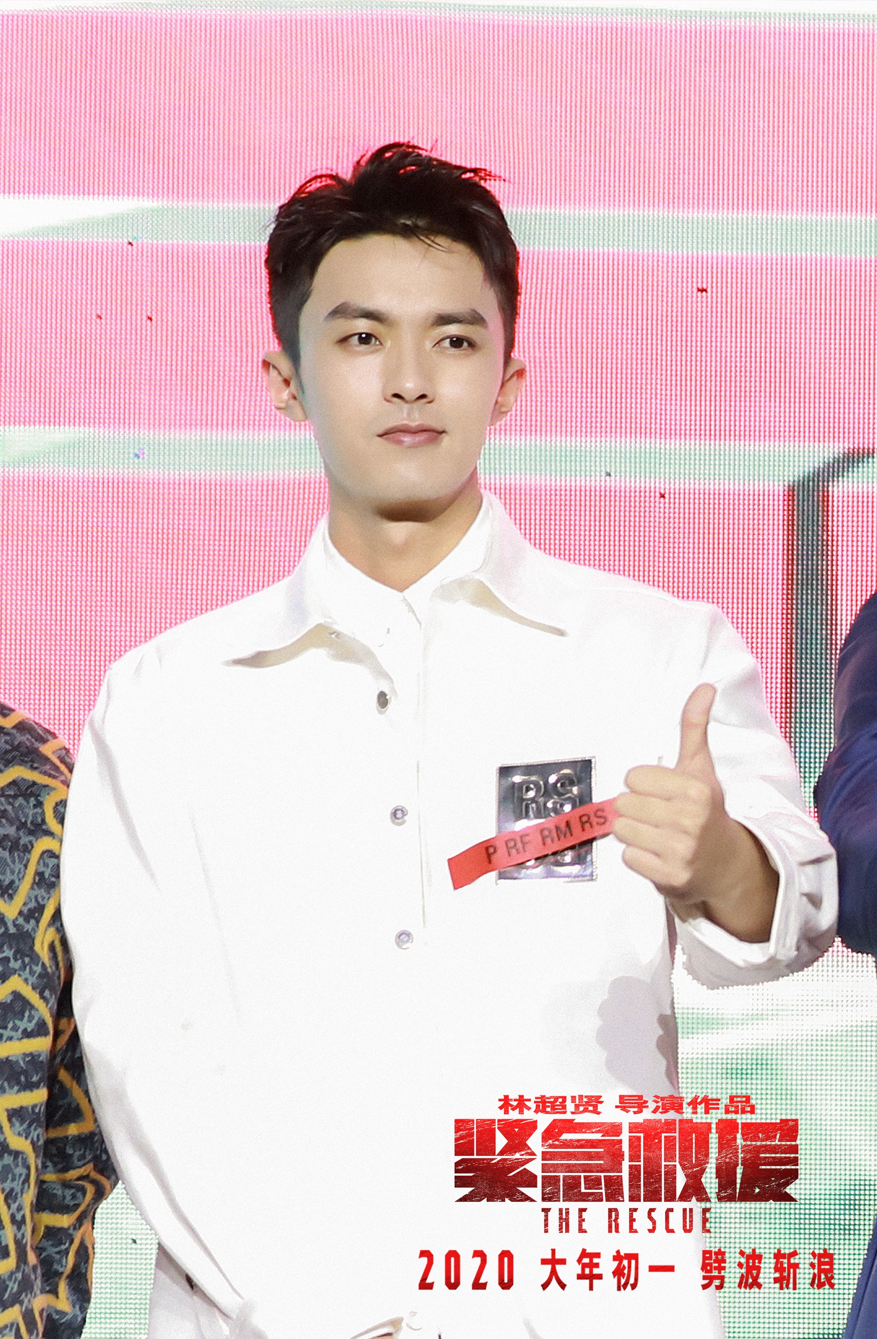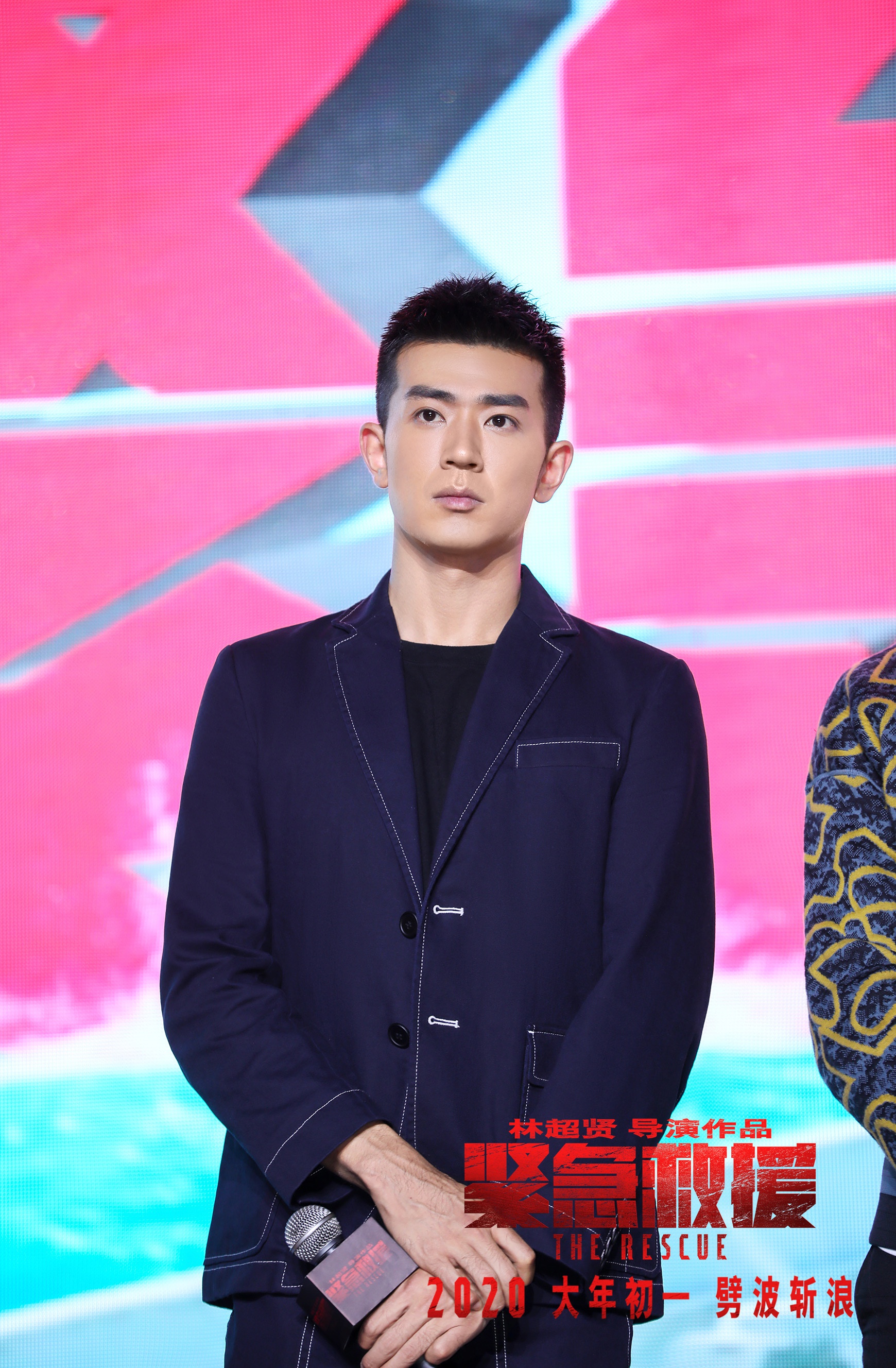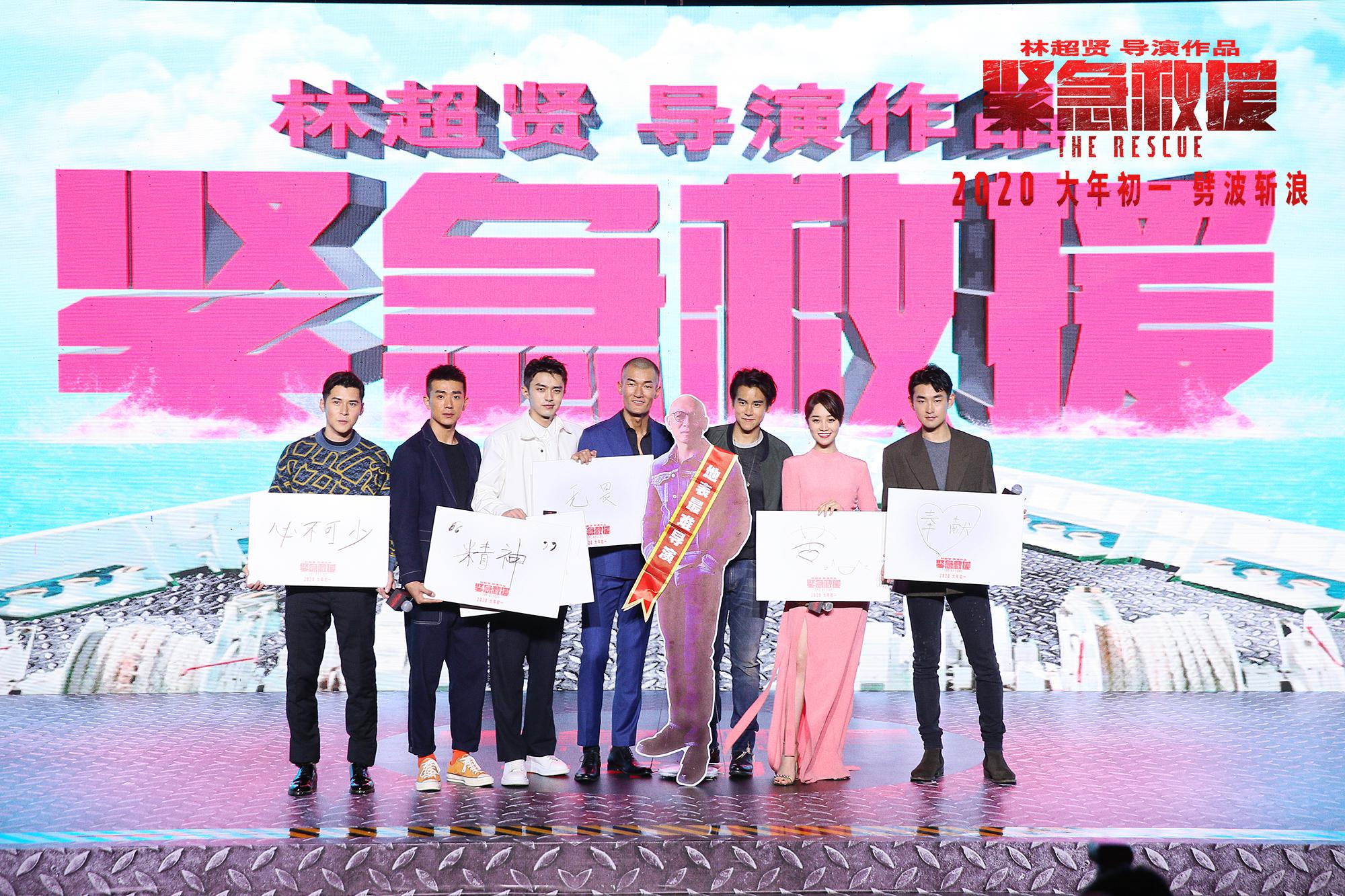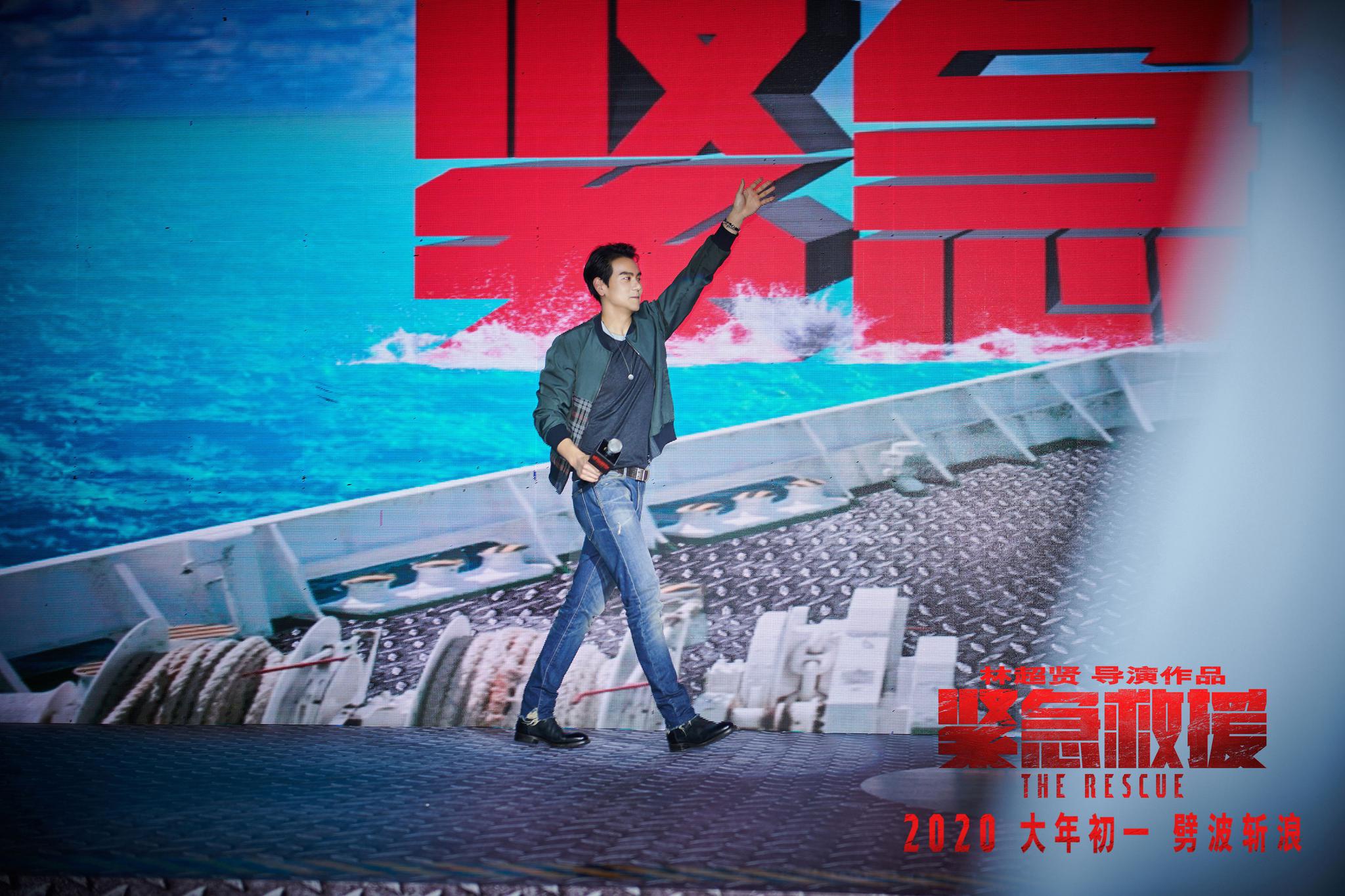 当天导演林超贤虽未能到场,却发来VCR与主演们互动。早在定档发布会时,由于高难度和高强度的拍摄,导演就曾遭受主演们的集体“控诉”。所以这次他先发制人“威胁”救援小队:“不要趁我不在的时候‘吐槽’我,因为我在赶后期,可以随时剪掉你们的戏,要想清楚再说!”接着他又与现场观众分享道:“当时我去拍《紧急救援》是因为被救捞人精神打动,你们舍身忘己去拯救生命,这种精神我非常敬佩,感谢有你们的存在。”说到此处,林超贤特地向中国救捞人敬礼,他还表示希望用电影的力量把救捞精神传递给万千观众。虽然受到了导演“威胁”,但彭于晏还是代表救援小队为林超贤的人形立牌挂上了“地表最难导演”的彩带,王彦霖等队员还不忘与导演的人形立牌亲密互动,现场气氛热烈,观众情绪高涨。