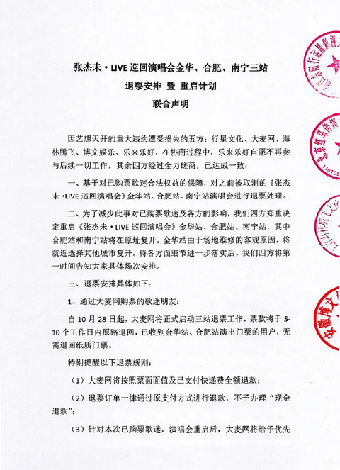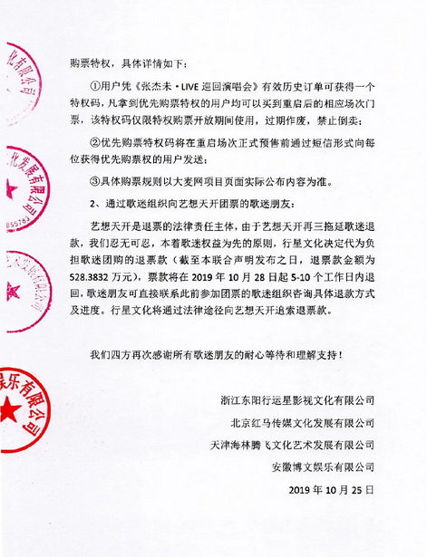 25日,张杰方发布一则张杰未·LIVE巡回演唱会金华、合肥、南宁三站退票安排暨重启计划联合声明。声明表示:”基于对已购票歌迷合法权益的保障,对之前被取消的演唱会进行退票处理;此外,为了减少此事对已购票歌迷及各方的影响,决定重启演唱会。而由于艺想天开再三拖延歌迷退款,行星文化决定代为负担歌迷团购的退票款528.3832万元。“