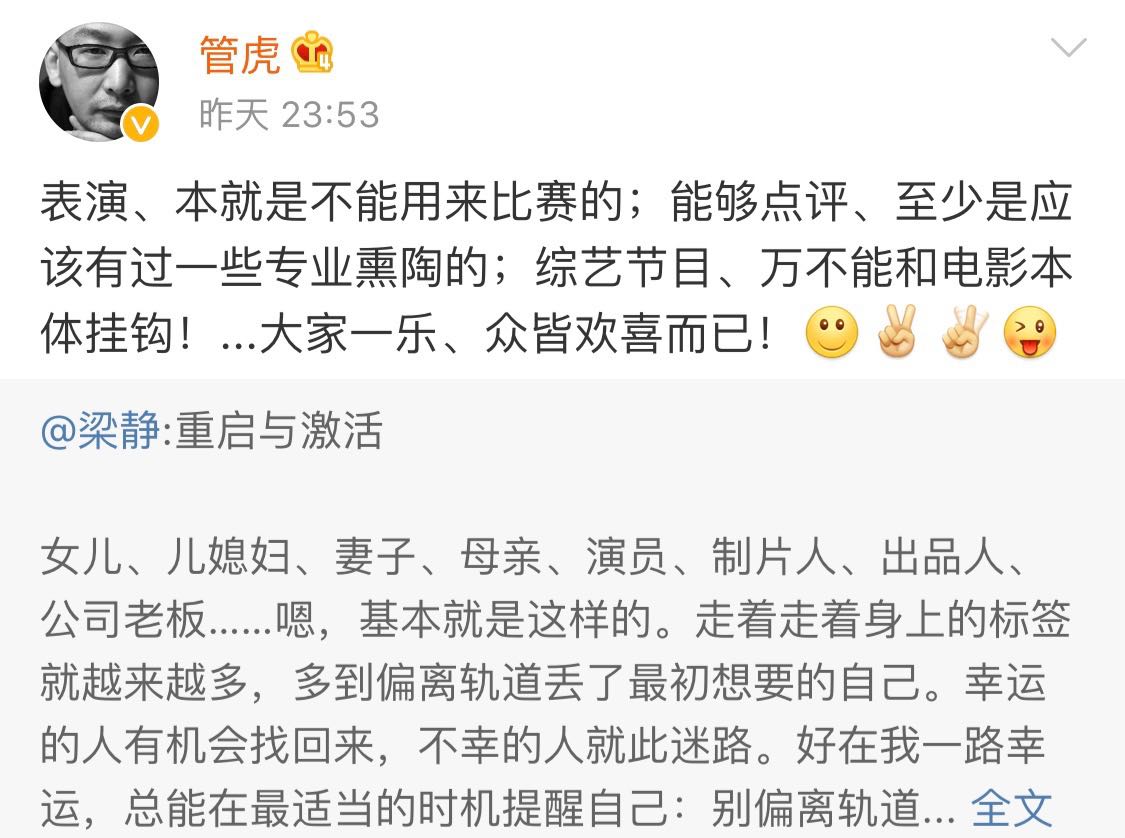随后,导演管虎转发梁静长文并作出评价,身兼双重身份的他巧妙地表达了自己作为一个丈夫对妻子的认可与支持。从专业电影导演的角度,管虎客观地表达了自己对表演的定义和对专业性点评的重视,认为“表演,本就是不能用来比赛的”,但同时也认为参加综艺也是为了“大家一乐,众皆欢喜而已”,既不失专业又暗暗鼓励了妻子,网友也纷纷表示:“导演也太甜了吧”。