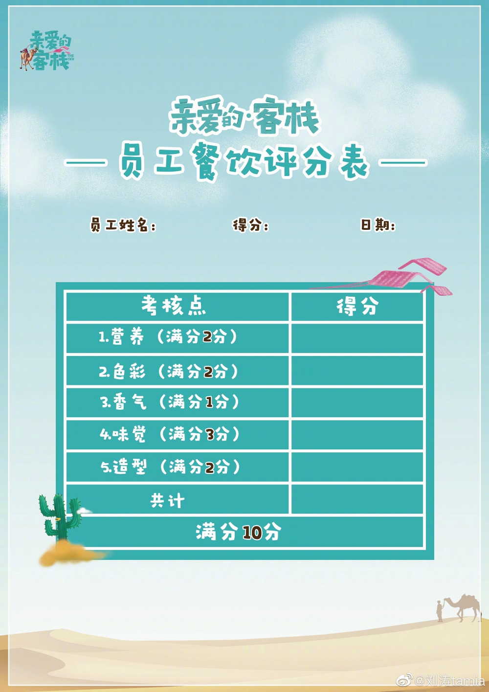 在刘涛曝光的《亲爱的客栈》评分表中,管家评分、员工铺床技能评分、员工餐饮评分都十分的细致,而在节目中刘涛也是公平公正的按照表格明细执行。在最新一期节目中,刘涛带着之前成绩不理想的阚清子重新体验了一回“管家评分”;对于马天宇铺床技能的补考,刘涛也是给予了很大的肯定和鼓励;与张翰之间的互动更是笑点十足。除了老板身份必须遵守的规章制度外,作为朋友,也是刘涛也是暖心地鼓励大家,把员工们紧紧的凝聚在一起。