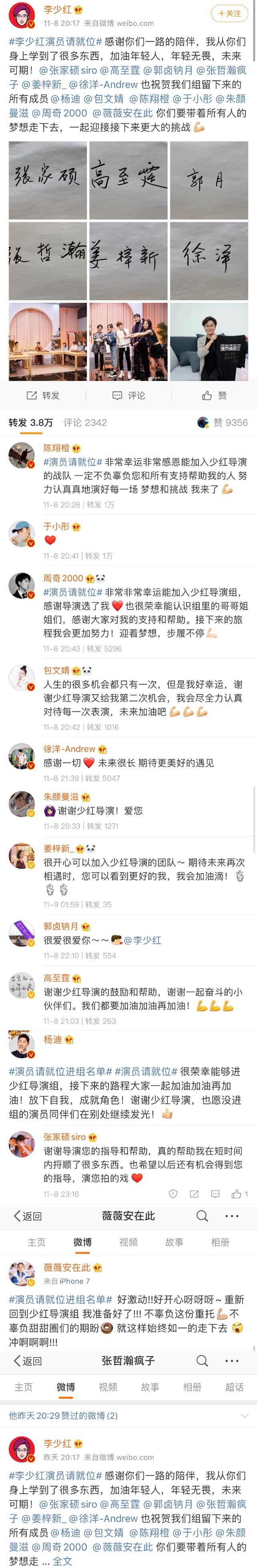 面临即将离开的选手,李少红表达出自己的不舍,并在采访中说,“如果我的名额够,我希望他们都能留下来”。分开并不代表着结束,少红导演明确表示以后自己的戏很希望和这些演员合作。节目播出后李少红发了一条微博,配图是她战队离开的所有成员们。组员之间也非常温暖,纷纷来微博互动表示感谢导演,可以说是非常有爱了。
