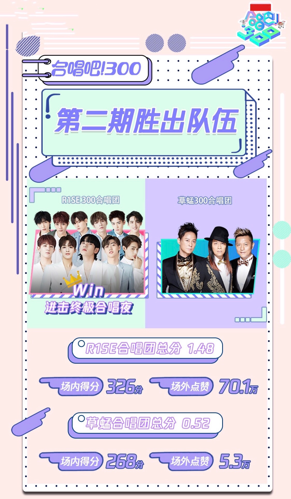 在《合唱吧!300》第二期中,已经获得场内优胜的R1SE男团,在48小时的场外点赞中更是势不可挡,已成功进入终极合唱夜,将与07快乐男声及另外三组合唱发起人一决高下,共同竞争本季最强互动演唱。而在第三期节目中,火箭少女101与声入人心男团的战火已经燃起,两者中谁又将成功摘夺终极合唱夜的名额?本周日晚八点,悬念即将揭晓。
